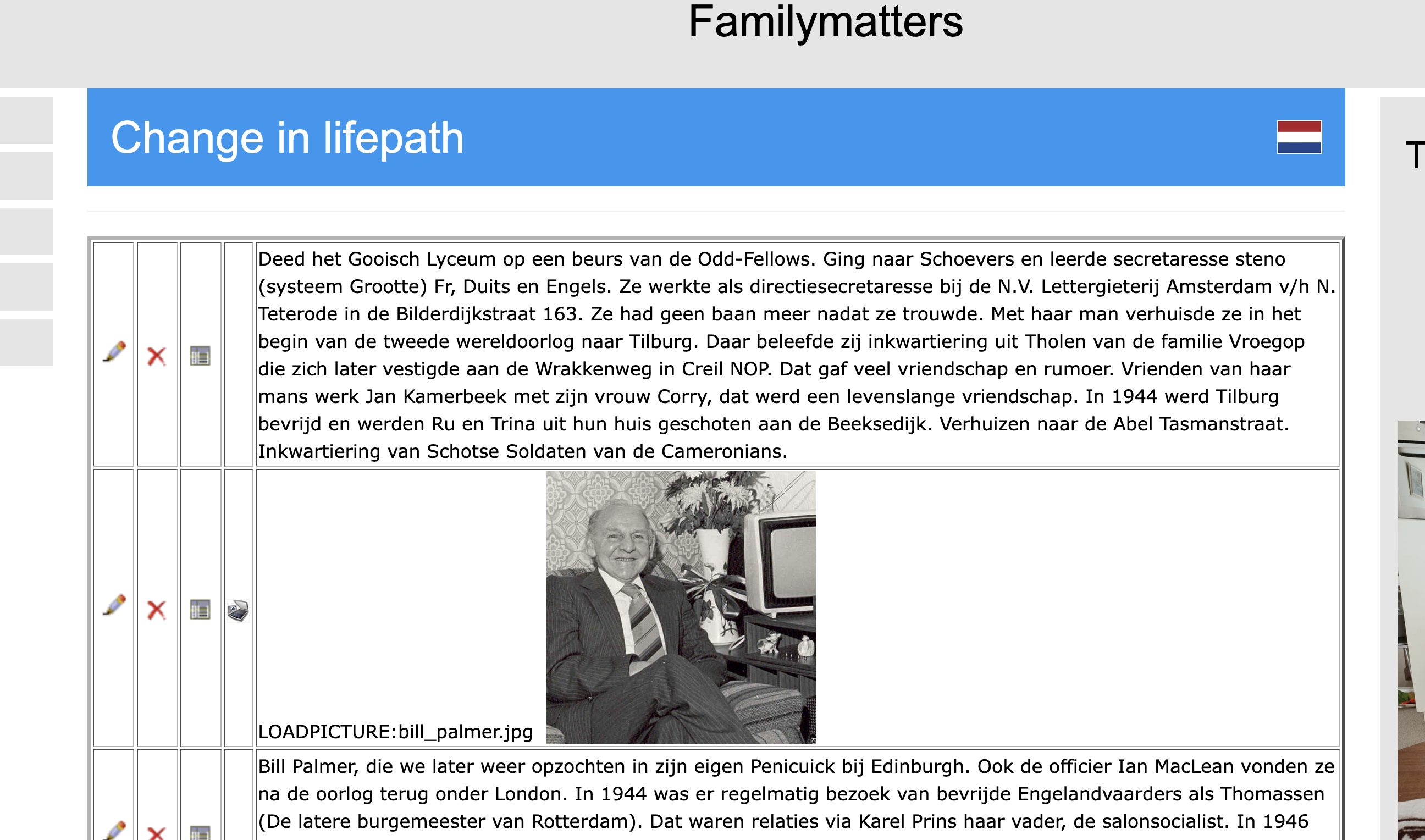 Onder de foto van een familielid staat een potlood icoon. Als je daarop klikt kan je de inhoud van de verschillende rubrieken aanpassen, aanvullen of verwijderen.